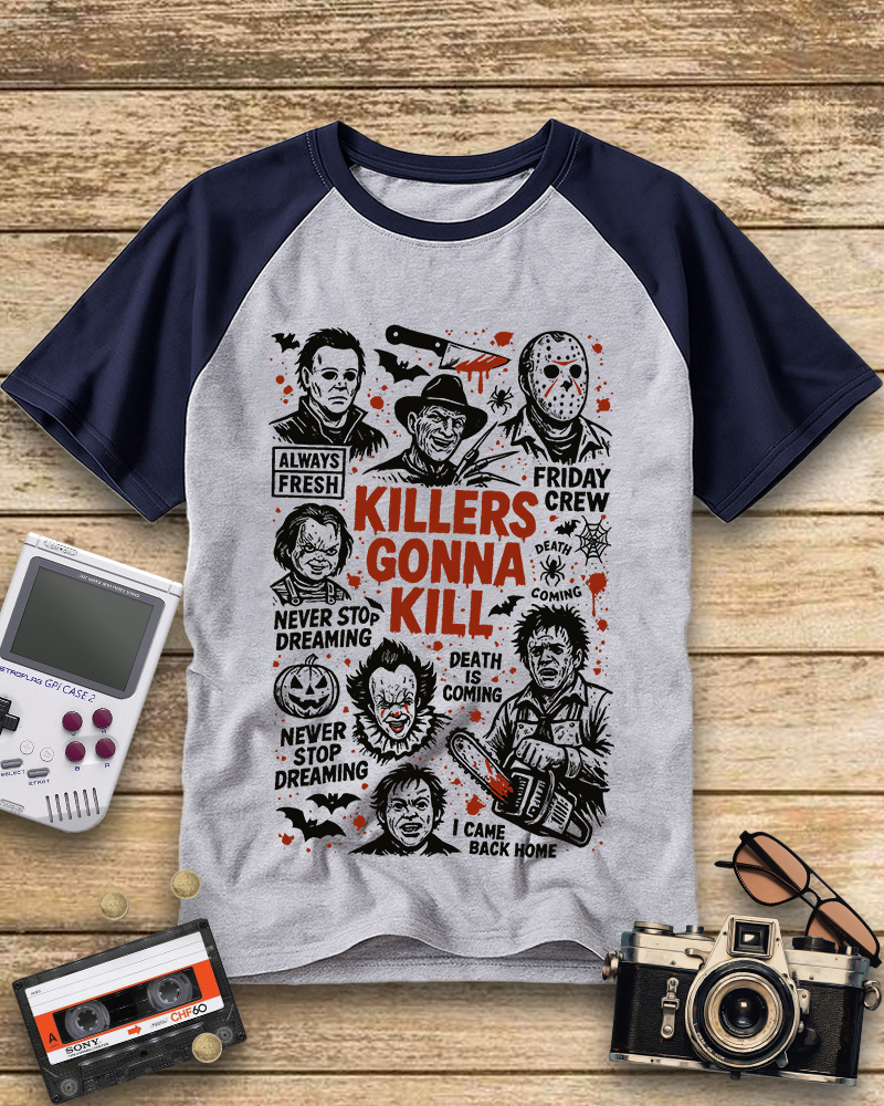 TheRetroTee Killers Gonna Kill Halloween Raglan Baseball T-Shirt$29.99 USD -