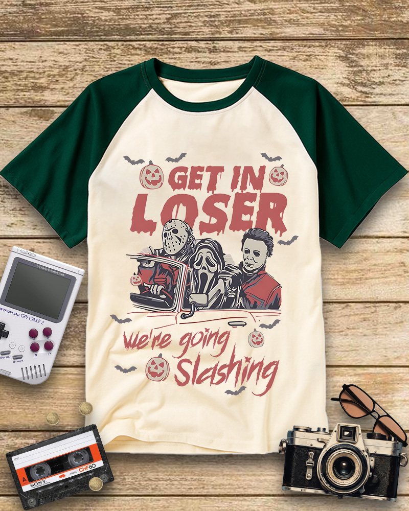 TheRetroTee Get In Loser We're Going Slashing Raglan Baseball T-Shirt$29.99 USD -