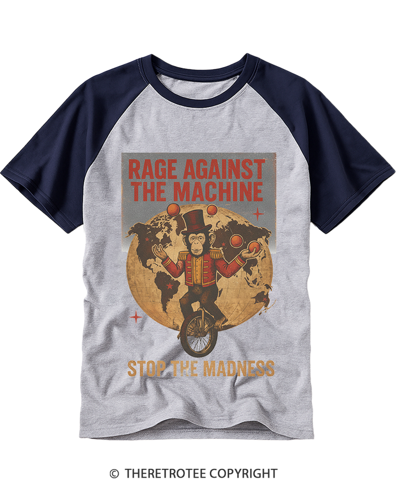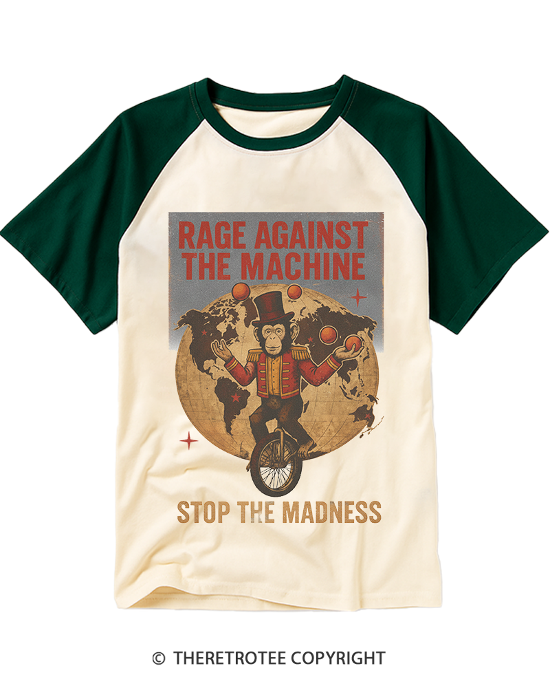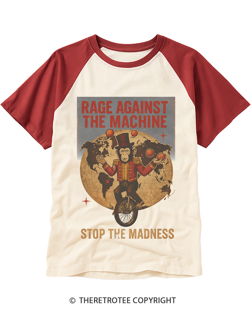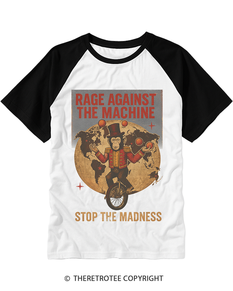 TheRetroTee Stop The Madness Circus Monkey Protest Rock 1990s Raglan Baseball T-Shirt